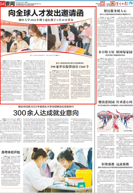 《煙臺日報》3月19日04要聞版刊發《向全球人才發出邀請函 煙臺大學2024年博士論壇將于3月30日舉辦》報道