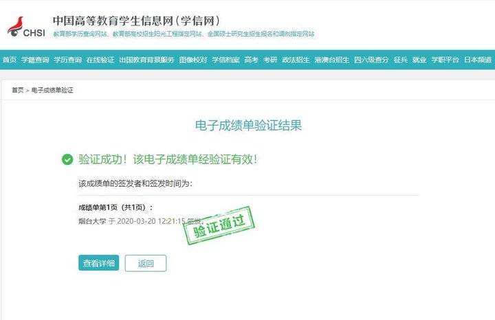 這種可信電子成績單,是具有電子簽章的PDF版的成績單文件。隨著2019年4月《國務院關于在線政務服務的若干規定》的公布,電子成績單的法律效力進一步明確。此次啟用的電子成績單,采用了國密算法和國際加密算法相結合的雙重數字簽名,不僅有力保證了文件的可信度和不可篡改性,而且使得文件具有更強的安全性和自主性。煙臺大學可信電子成績單與中國高等教育學生信息網(學信網)的有效對接,極大增強了電子成績單驗證的權威性和可信性。
