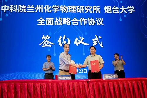 7月23日,煙臺大學與中國科學院蘭州化學物理研究所在山東省實驗室建設現場推進會上簽署全面戰略合作協議。省科技廳廳長唐波、煙臺市市長陳飛、省科技廳副廳長于書良、煙臺大學黨委書記張偉出席并見證簽約。中國科學院蘭州化學物理研究所副所長周峰與煙臺大學副校長李合亮代表雙方簽約。