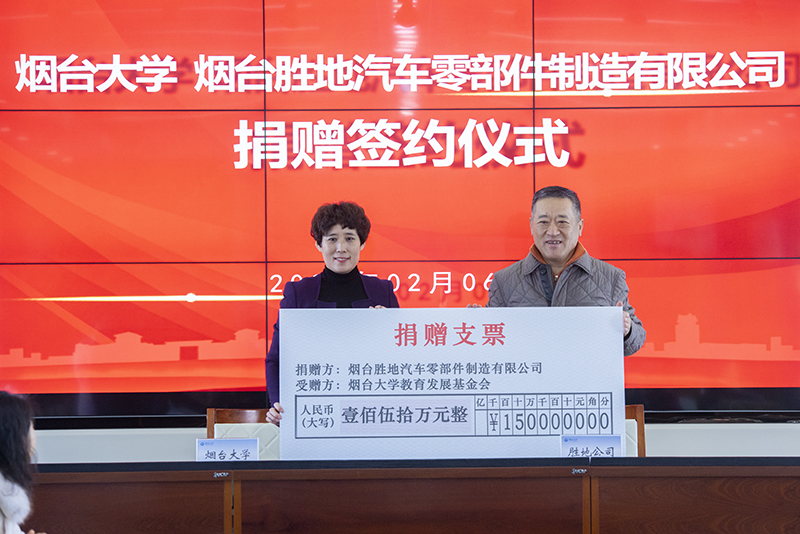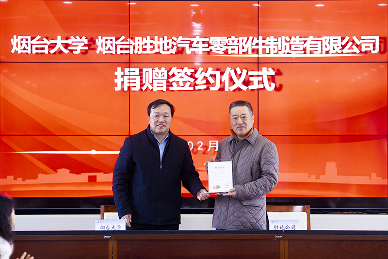 【本站訊】2月6日上午,在農歷新年即將到來之際,煙臺大學、煙臺勝地汽車零部件制造有限公司捐贈簽約儀式舉行,勝地公司捐贈150萬元支持學校教育事業發展。煙臺勝地汽車零部件制造有限公司董事長董軍,深圳角度投資有限公司董事長溫雷,煙臺聲嘉投資有限公司董事長、煙臺市音樂家協會副主席張小東,煙臺大學校長郭善利出席儀式。黨委常委、黨委宣傳部部長于秀國主持。