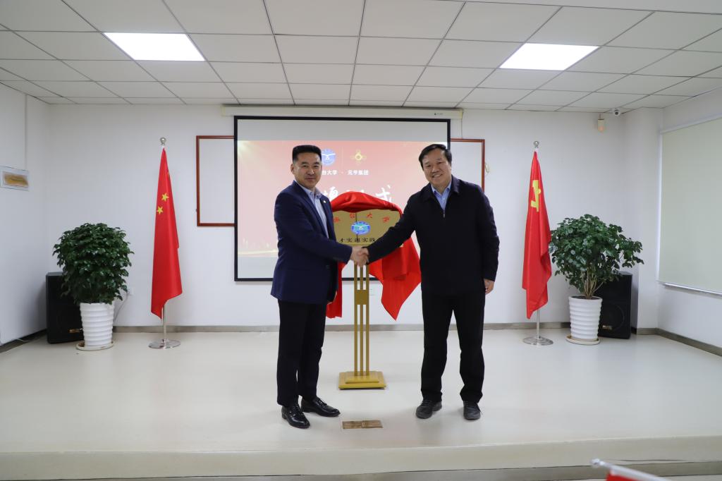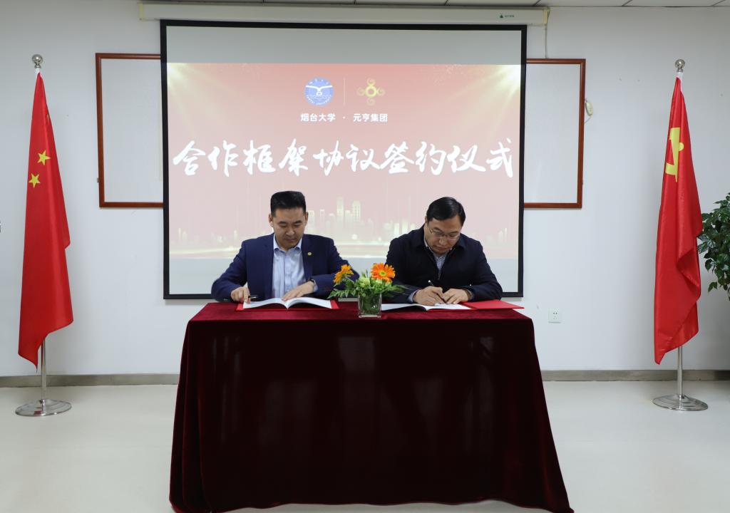 李合亮、李國森代表雙方簽署了《煙臺大學-元亨集團合作框架協議》。煙臺大學教育發展基金會秘書長李育華代表簽署捐贈協議并向李國森頒發捐贈證書。郭善利、李國森為“煙臺大學人才實訓實踐基地”揭牌。
