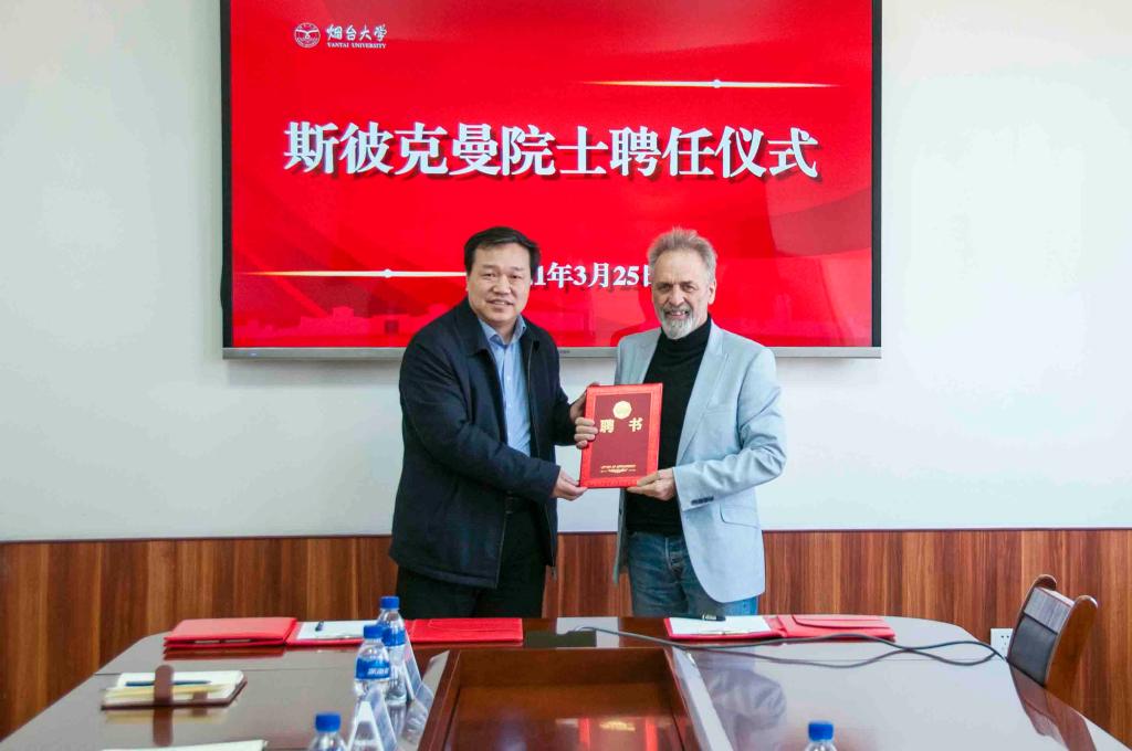 【本站訊】3月25日下午,煙臺大學(xué)舉行中科院外籍院士約翰·羅杰·斯彼克曼兼職煙臺大學(xué)教授聘任儀式,校長郭善利發(fā)表致辭并為斯彼克曼院士頒發(fā)聘書。副校長孫祥斌及人事處、藥學(xué)院等相關(guān)單位負責(zé)人參加聘任儀式。