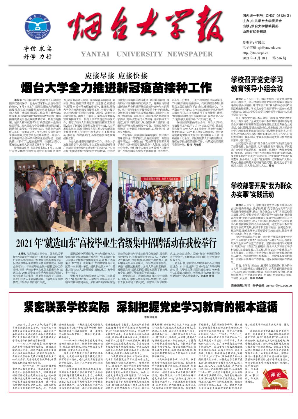 一是緊密聯系學校改革發展實際,深刻領會開展黨史學習教育對于全面推進學校高質量發展的重大意義。今年是“十四五”開局之年,也是煙臺大學全面開啟山東省高水平大學與高水平學科建設的關鍵之年。深入貫徹落實習近平總書記重要講話精神,在全校高標準高質量開展黨史學習教育,充分汲取百年黨史蘊含的豐富科學真理與偉大精神力量,對于鞏固深化“不忘初心、牢記使命”主題教育成果,全面落實立德樹人根本任務,牢牢把握正確辦學方向,不斷強化為黨育人、為國育才的教育使命,科學謀劃新時期高質量發展路徑,奮力攻堅改革發展中的各種艱難險阻,努力實現全體煙大人矢志不渝建設高水平大學的奮斗目標,具有重大而深遠的意義。