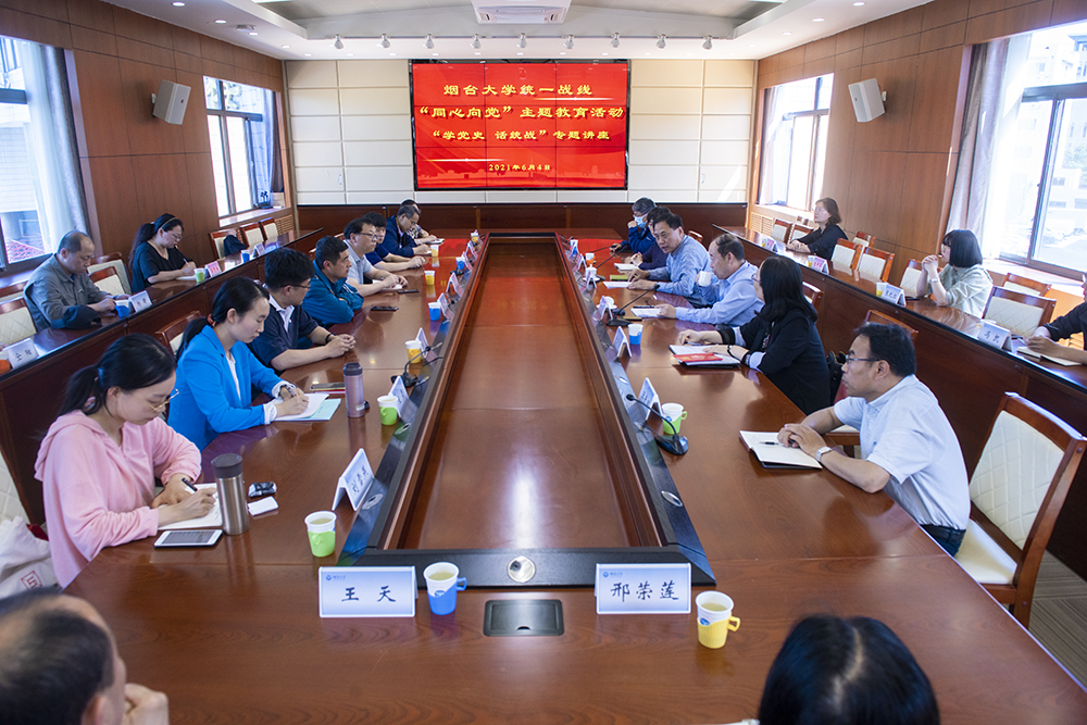 【本站訊】為扎實(shí)開(kāi)展黨史學(xué)習(xí)教育,深入推進(jìn)“同心向黨”主題教育活動(dòng),引領(lǐng)煙臺(tái)大學(xué)黨外知識(shí)分子同心共筑中國(guó)夢(mèng)、砥礪奮進(jìn)新征程, 6月4日下午,學(xué)校在育秀大樓316會(huì)議室舉行“學(xué)黨史 話統(tǒng)戰(zhàn)”主題宣講。煙臺(tái)市委統(tǒng)戰(zhàn)部副部長(zhǎng)、市社會(huì)主義學(xué)院副院長(zhǎng)于忠杰應(yīng)邀作專題報(bào)告,校黨委副書記張殿臣主持并講話,黨委統(tǒng)戰(zhàn)部、各民主黨派、統(tǒng)戰(zhàn)團(tuán)體負(fù)責(zé)同志和黨外知識(shí)分子代表參加。