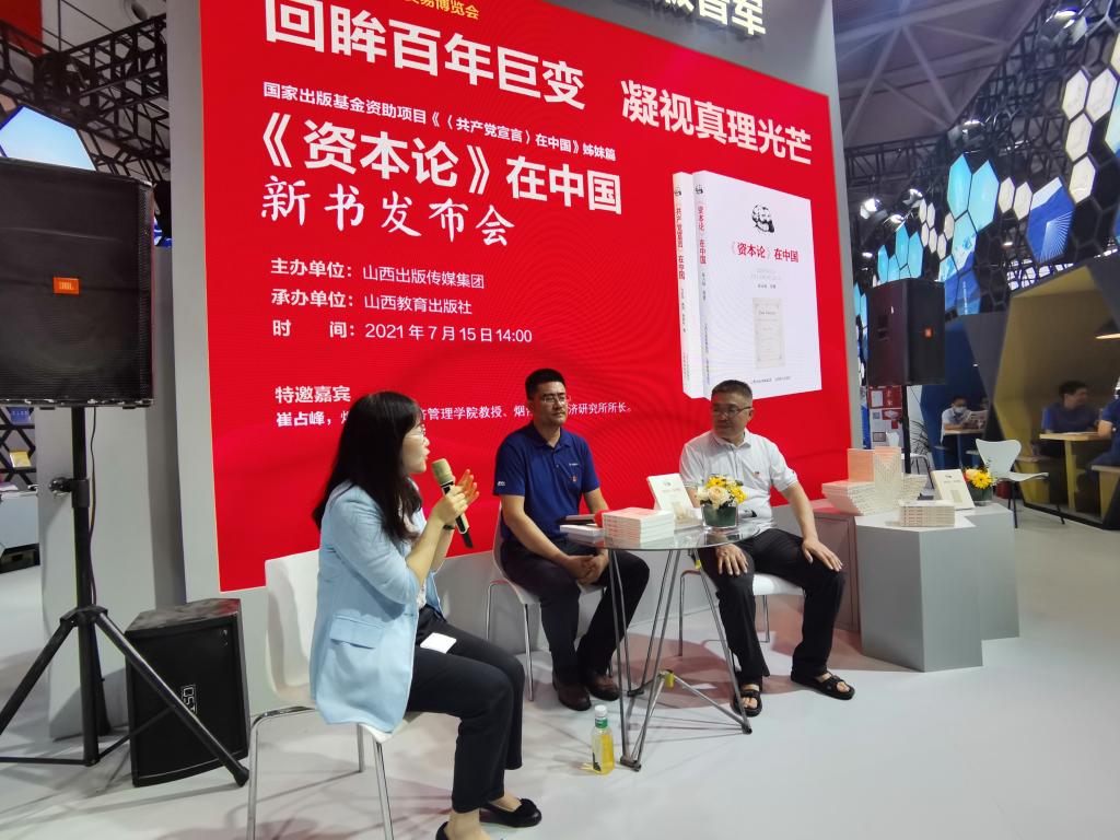 【本站訊】日前,由煙臺大學(xué)經(jīng)濟研究所所長、經(jīng)濟管理學(xué)院崔占峰教授主編的《<資本論>在中國》在山西教育出版社正式出版。7月15日,正值第30屆全國圖書交易博覽會開幕,《<資本論>在中國》新書發(fā)布會在山東國際會展中心山西展區(qū)舉行。發(fā)布會現(xiàn)場,山西教育出版社總經(jīng)理王永江致辭,崔占峰與該書策劃者之一、山西教育社重點圖書策劃室主任郭志強就《<資本論>在中國》的策劃緣起、創(chuàng)作過程、厚重內(nèi)涵以及出版意義等進行了深入討論。期間,他不時與讀者交流互動,分享寫作心得。