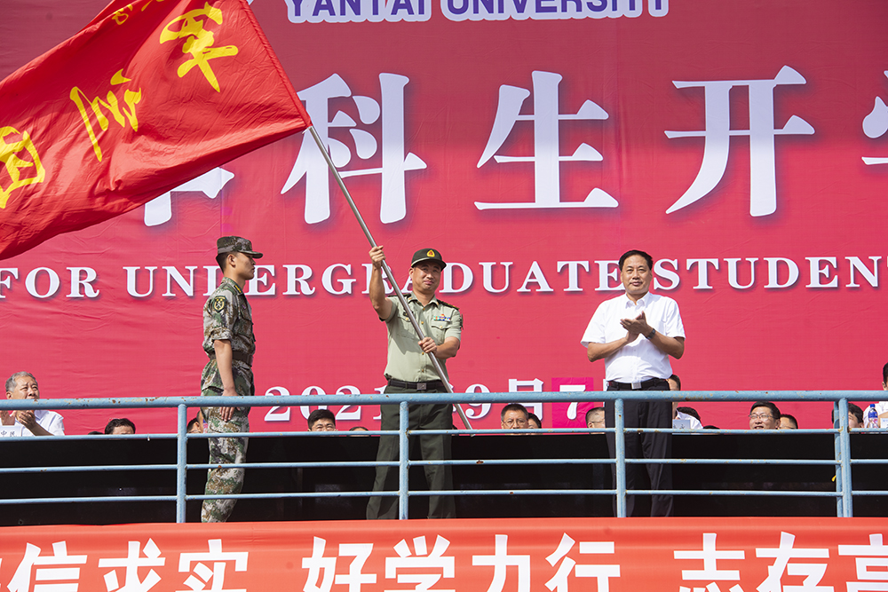 煙臺大學黨委書記張殿臣為2021級學生軍訓團授旗