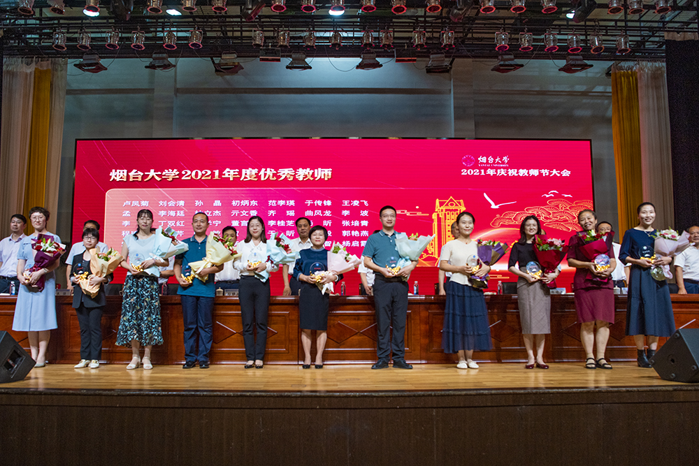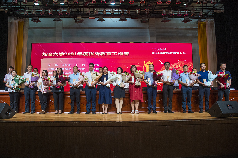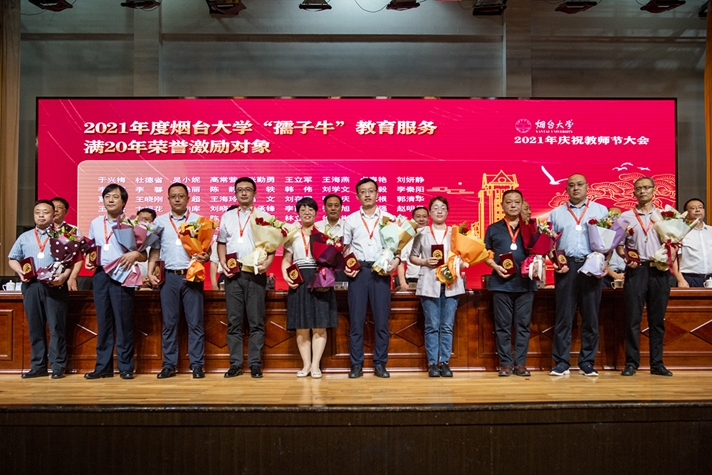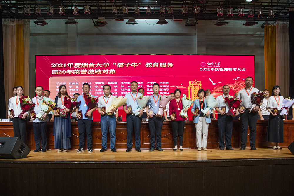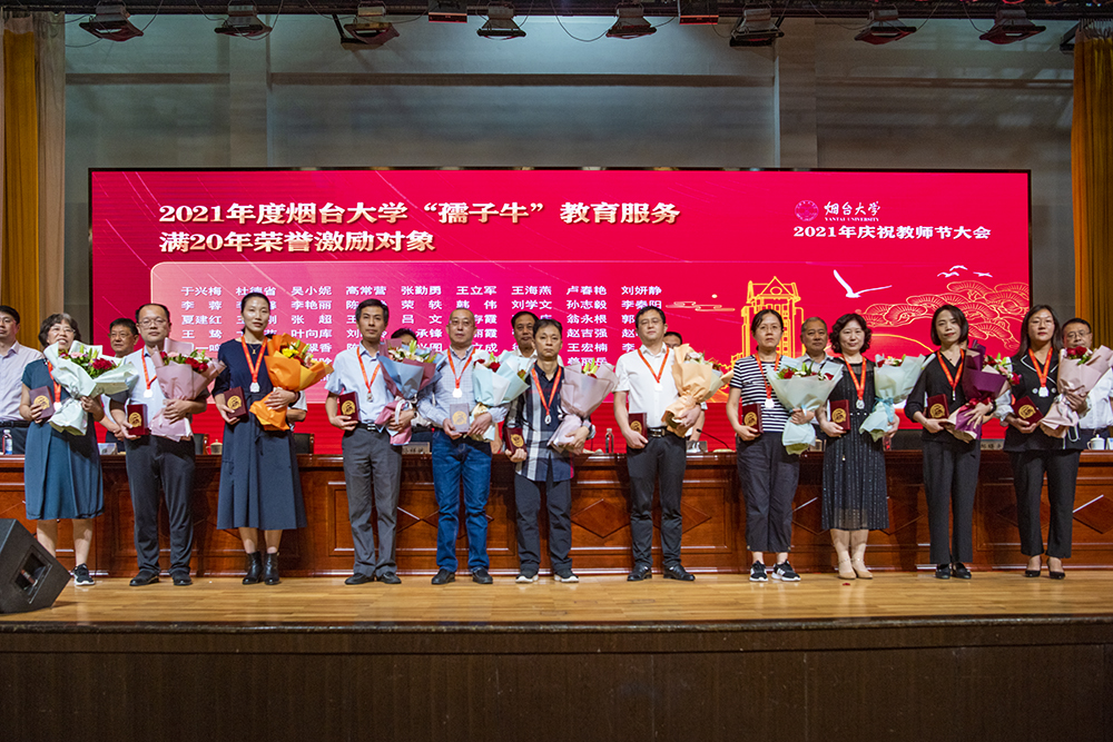 大會在雄壯的國歌聲中拉開帷幕。副校長孫祥斌、宋中民分別宣讀《中共煙臺大學委員會關于表彰2021年度優(yōu)秀教師和優(yōu)秀教育工作者的決定》《關于向在教育服務崗位工作滿30年、在煙臺大學教育服務崗位工作滿20年的教師和教育工作者頒發(fā)“孺子牛”榮譽紀念獎章的決定》。受表彰和激勵的老師滿懷幸福喜悅的心情,在全場熱烈的掌聲中上臺接過獎杯、佩戴紀念獎章,學生代表向尊敬的老師獻上了承載著感恩和祝福的鮮花。