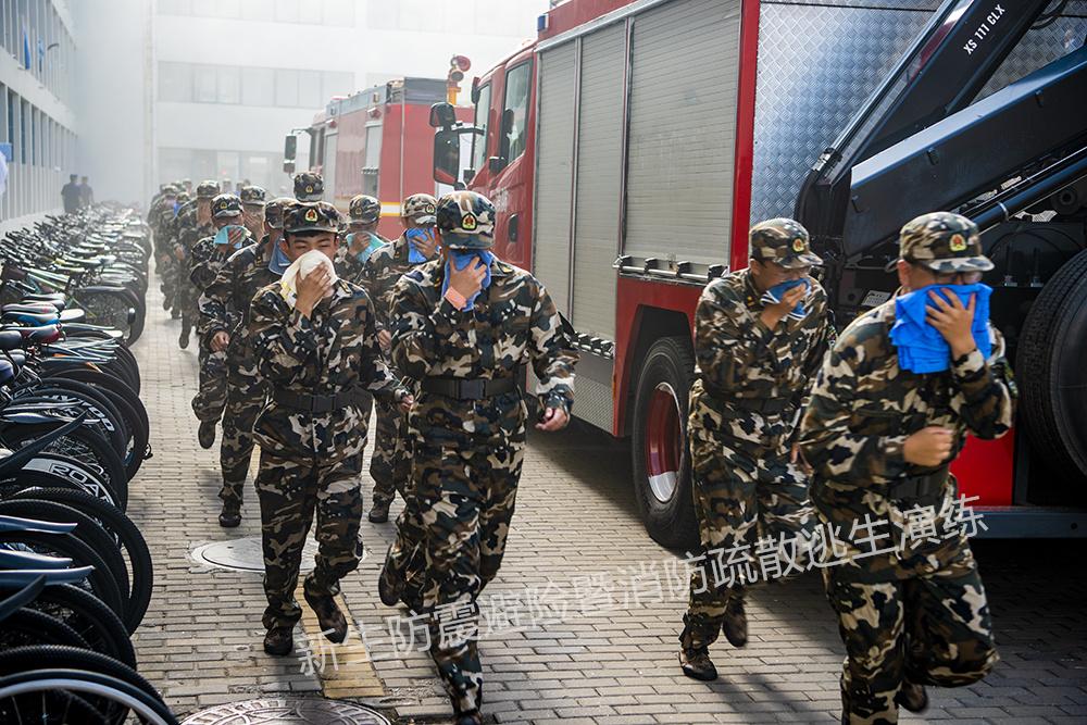此次演練目包括被困人員逃生自救、火災(zāi)現(xiàn)場被困人搜救、消防器材展示和現(xiàn)場滅火演練等內(nèi)容。隨著模擬地震警報響起,全體新生按要求在宿舍內(nèi)采取緊急自救措施。隨后,保衛(wèi)處在四棟學(xué)生宿舍樓同時模擬突發(fā)火災(zāi),學(xué)生用濕毛巾捂住口鼻,彎腰扶墻有序撤至安全疏散點。消防救援車及時進入演習(xí)現(xiàn)場,用高壓水槍撲滅模擬著火點,同時將模擬傷員救至安全地點并及時組織醫(yī)護人員展開模擬救治。隨后,消防指戰(zhàn)員演示了高噴消防車的高空噴射,300余名新生義務(wù)消防員進行了消防器材展示和現(xiàn)場滅火演練。