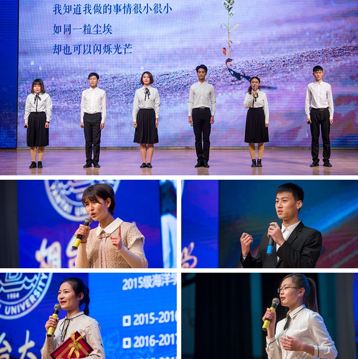 優秀學生干部獎學金獲得者人文學院林慧分享了做一名有擔當、講奉獻的學生干部的心路歷程,金正環保獎學金獲獎者數學與信息科學學院孫飛鴻展示了動靜間皆具活力的青春風采,本科生國家獎學金獲得者海洋學院杜春水講述了不服輸不放棄,堅持奮斗的成長歷程,研究生國家獎學金獲得者化學化工學院李艷紅詮釋了耐得住寂寞,刻苦鉆研的卓越風華,先進班集體獲得者代表環境與材料工程學院邱藝敏講述了發揮班級凝聚力,創建優良學風班風的過程。由6名獎學金獲得者朗誦的《在煙大奮進的每一天》刻畫出煙大學子腳踏實地,知行合一,用奮斗書寫青春華章的精神風貌,表達了他們在追逐夢想的路上,無所畏懼,奮勇向前的壯志激情。