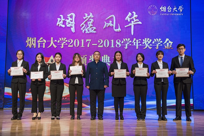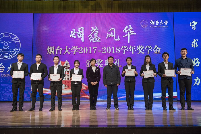 典禮以展示不同類別獲獎學子風采的視頻短片《奮斗點亮青春》開場。在全場熱烈的掌聲中,學校領導分別登臺為各類獎學金獲得者、先進班集體、社會實踐優秀團隊代表頒獎,并與獲獎代表合影。綠葉制藥集團人力資源部總監劉曉梅、山東圣凱建筑設計咨詢有限公司副總經理牛世強、馨德獎學金設立者修先剛、金正環保科技有限公司人力資源總監費煙平、煙臺金海洋國際船舶管理有限公司總經理劉清英、山東中潤海聯生態產業科技公司總經理陳為國等社會類獎學金設立代表受邀出席,并為獲社會類獎學金的個人和集體代表頒獎。