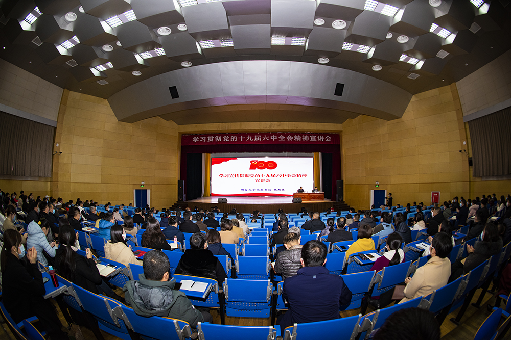 【本站訊】12月9日下午,煙臺大學學習貫徹黨的十九屆六中全會精神首場宣講會舉行,黨的十九屆六中全會精神全省高校宣講團成員、煙臺大學黨委書記張殿臣面向學校副科級及以上干部,民主黨派、統戰團體負責人,全體思政課教師、輔導員以及部分師生代表進行宣講。省委黨史學習教育第四巡回指導組成員呂建設到場指導。黨委常委、副校長孫祥斌主持。