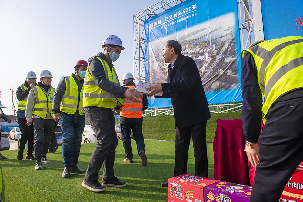 封頂儀式結束后,宋中民代表學校向施工現場的建筑工人代表發放慰問品,并看望了學校科教園區專班工作人員,勉勵他們再接再厲,向全校師生交上一份園區建設的滿意答卷。