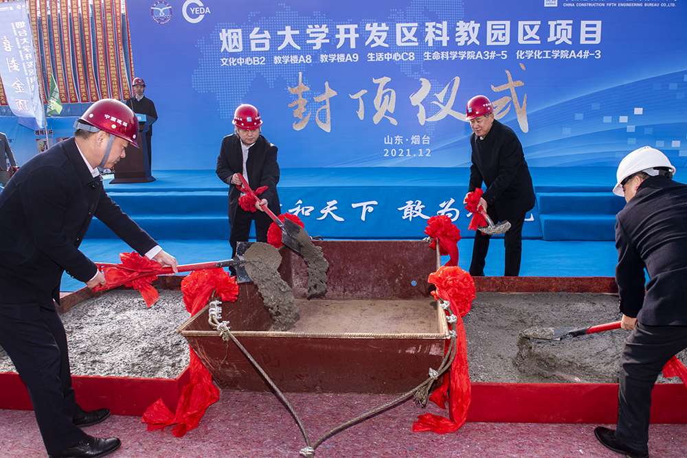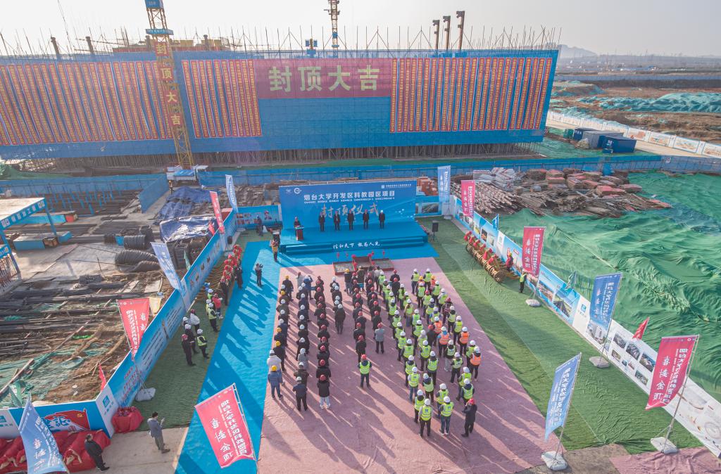 煙臺大學開發區科教園區位于煙臺八角灣中央創新區,圍繞開發區高端化工、生物科技、現代海洋、高端裝備等重點產業,布局化學化工、生物食品、海洋科學、機械工程等學科專業群,致力打造國內一流的實踐教學、人才集聚和科研創新轉化平臺。園區規劃占地1000余畝,可滿足全日制在讀本科生、研究生、留學生12000人。其中一期占地610畝,建筑面積42萬平方米,投資26億元,已于今年5月28日正式開工建設。除此次封頂的6棟單體建筑外,春節前將完成其它2棟單體建筑的封頂,校內湖泊將完成三分之一的湖體建設,其余單體將施工至3-4層。2023年9月,高水平、創新型、國際化的科教園區將正式迎來首批煙大學子。