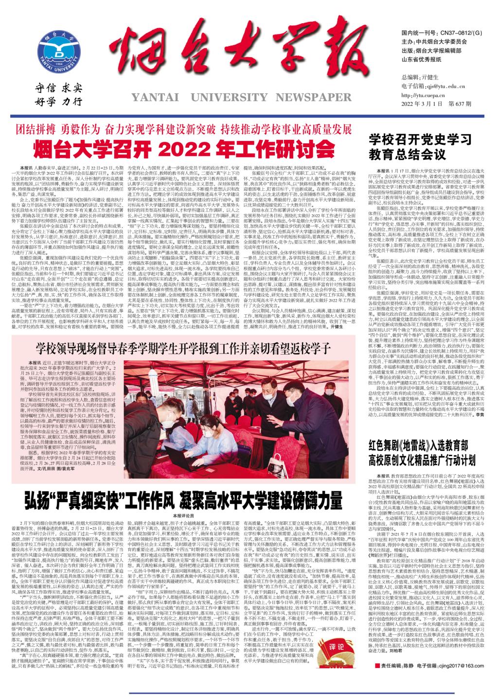 2月下旬的煙臺依然春寒料峭,但煙大校園里卻處處涌動(dòng)著拼搏奮進(jìn)的熱潮。2月22日-23日,煙臺大學(xué)2022年工作研討會召開,會議總結(jié)了過去一年學(xué)校主要發(fā)展成績,剖析了當(dāng)前學(xué)校發(fā)展面臨的新形勢新任務(wù)。黨委書記張殿臣在學(xué)校工作研討會上的講話,深刻闡明了新形勢下學(xué)校建設(shè)高水平大學(xué)、推進(jìn)高質(zhì)量發(fā)展的使命要求,深入剖析了當(dāng)前學(xué)校作風(fēng)建設(shè)中存在的問題短板,向全校教職員工發(fā)出了“加強(qiáng)作風(fēng)建設(shè)、提高執(zhí)行能力”的強(qiáng)烈號召,擲地有聲、發(fā)人深省、催人奮進(jìn)。本次研討會為我們做好全年工作明確了目標(biāo)、指明了方向,增強(qiáng)了做好工作的信心、決心和責(zé)任感、緊迫感。作風(fēng)建設(shè)不是抽象的,而是具體落實(shí)到每個(gè)干部職工身上的。全體干部職工要充分認(rèn)識強(qiáng)化作風(fēng)建設(shè)對促進(jìn)學(xué)校高質(zhì)量發(fā)展的極端重要性,以積極的姿態(tài)、認(rèn)真的態(tài)度、嚴(yán)實(shí)的作風(fēng),確保各項(xiàng)工作取得實(shí)效,推進(jìn)學(xué)校事業(yè)高質(zhì)量發(fā)展。