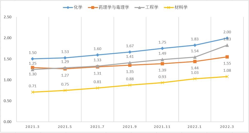 煙臺(tái)大學(xué)ESI全球前1%學(xué)科比值變化趨勢(shì)(2021.3-2022.3)