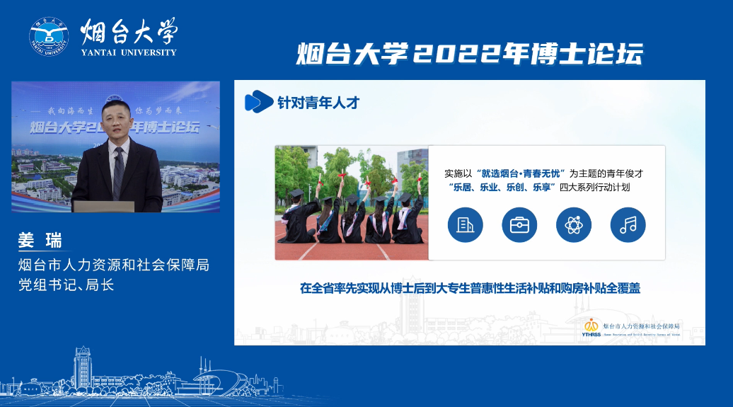 圍繞煙臺市人才政策,市人力資源和社會保障局局長姜瑞從“堅持優化提升,構建覆蓋各類人才的政策體系;堅持精準細致,實施一整套全方位個性化服務;堅持產才融合,搭建校地協同發展共享平臺”三個方面進行了全面深入解讀。就煙臺大學的人才引育政策,副校長孫祥斌從“提供良好待遇,讓人才工作生活有堅實保障;解決關鍵問題,讓人才工作生活無后顧之憂;搭建成長平臺,讓人才教學科研全方位發展;合理設置崗位,讓人才把握人生出彩機會”四個角度進行了全方位介紹。