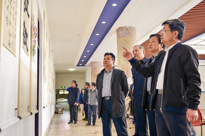 在四樓書畫展覽現場,校領導邊觀看邊點評,對本次活動給予充分肯定和高度評價。黨委書記張偉指出,縱觀教職工筆下乾坤,充盈著豐厚的藝術理想;通過“一代偉人鄧小平”的國畫作品歌頌改革開放先驅、通過“反腐倡廉功千古,近平時代強起來”的書法作品高揚社會主義核心價值觀的旗幟。國畫油畫裝點著樓道,流光溢彩,也是改革開放四十年來輝煌成就的一個個縮影和象征;篆書隸書草書行書紛至沓來,唐詩宋詞蘭亭滕王寫意人生,較好地詮釋出在中國共產黨的正確領導下,我校開拓創新、奮發有為的精神面貌和取得的成績。