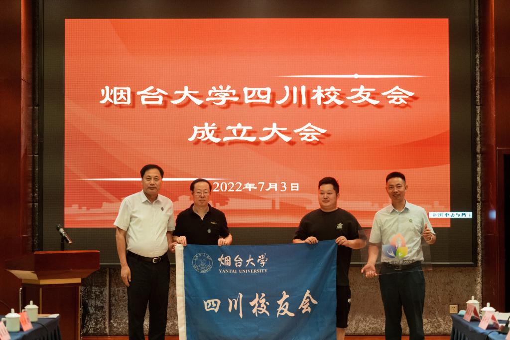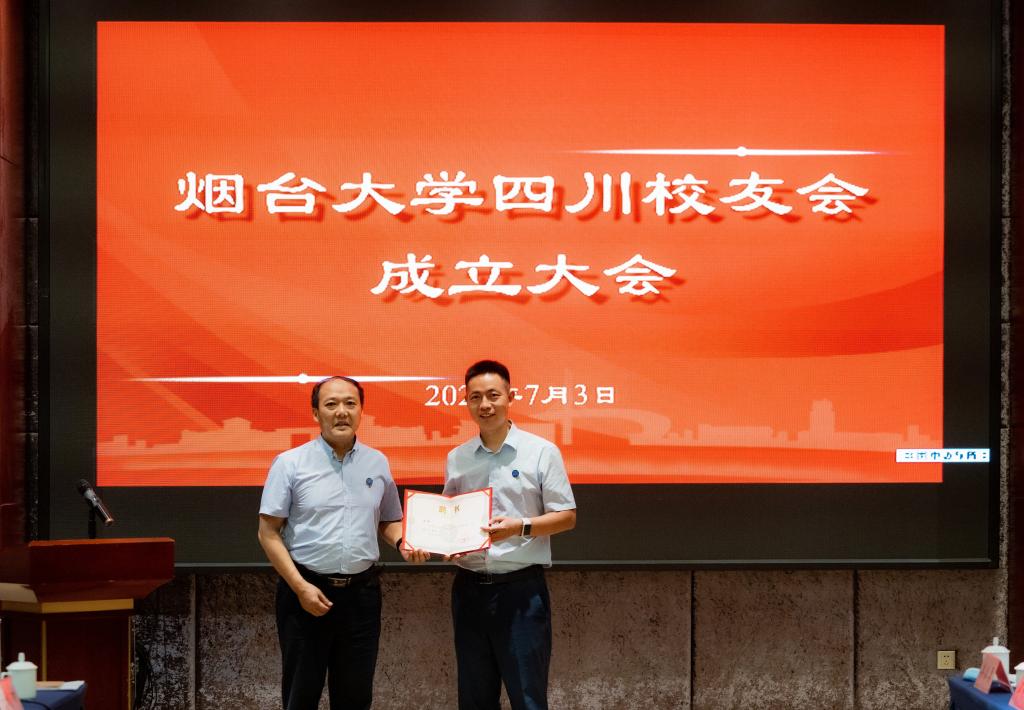 張殿臣宣布煙臺大學四川校友會正式成立,為四川校友會授牌、授旗。于秀國為四川校友會第一屆理事會會長、化學化工學院1999級校友李坤頒發會長聘書。