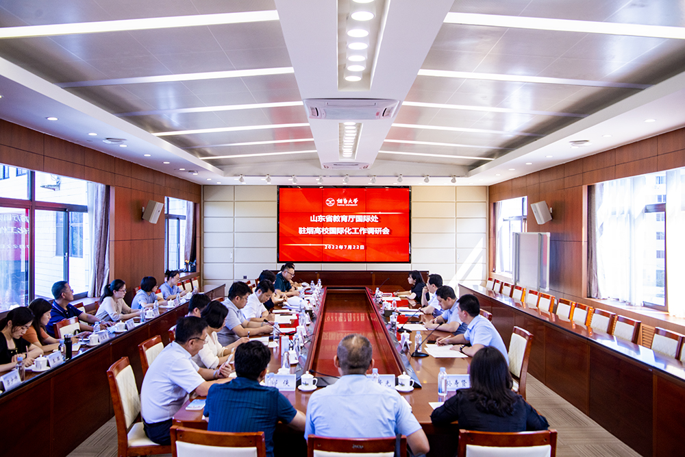 【本站訊】為推進新時期山東省教育國際交流工作高質量發展,7月22日,山東省教育廳國際處王夫海處長一行來校,就駐煙高校的高等教育國際化工作進行調研并舉行座談。煙臺大學黨委副書記、校長段培永,黨委常委、副校長宋中民,國際合作交流處全體人員參加活動。
