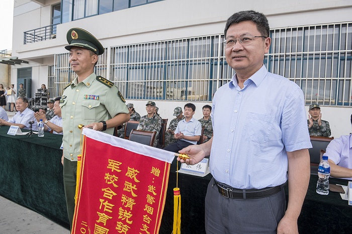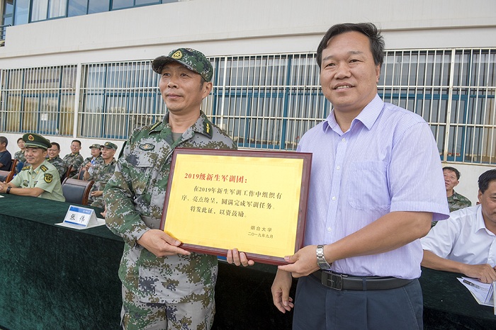黨委書記張偉向承訓部隊贈送錦旗,感謝部隊官兵為軍訓工作付出的辛勤勞動。校長郭善利為2019級新生軍訓團頒獎,對今年軍訓工作取得的優異成績給予肯定。副校長孫祥斌宣讀《煙臺大學關于表彰2019級學生軍訓先進集體及個人的決定》。學校對機電汽車工程學院、計算機與控制工程學院、經濟管理學院、光電信息科學技術學院、海洋學院、土木工程學院、人文學院、外國語學院等8個“軍訓先進學院”以及10個“分列式優勝方隊”、6個“歌詠比賽優勝隊”、19個“會操優勝排”、27個“內務優勝班”、165名“優秀學員”和20名“優秀教官”進行了表彰。優秀學員代表方浩羽、優秀教官代表李明陽先后發言。