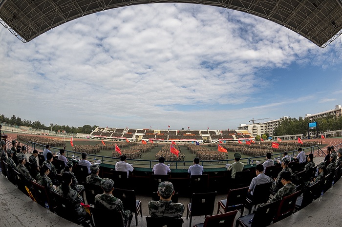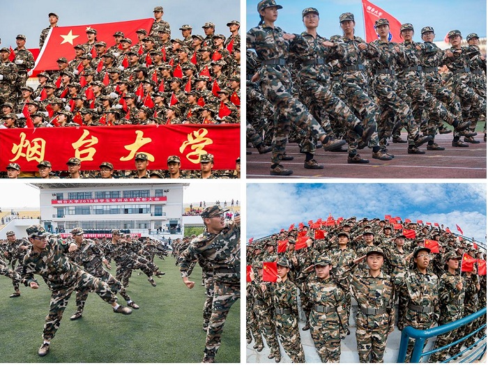 大會在激昂嘹亮的歌詠比賽中拉開帷幕。16支參賽隊個個意氣風發、英姿颯爽,展現出煙大學子奮勇爭先、積極進取的精神風貌。擒敵拳表演剛勁有力、虎虎生威,展示了新生集體的勃勃生機、青春風采,贏得現場陣陣掌聲。學生們擺出“1949”“2019”“70”等字樣,向新中國成立70周年獻禮。隨后,29個方隊以嚴整的軍容軍姿,依次走過主席臺接受學校領導及部隊首長檢閱。軍訓團的老師與同學們一同訓練并組成方隊參加分列式展示,展現全員全過程全方位育人實效。