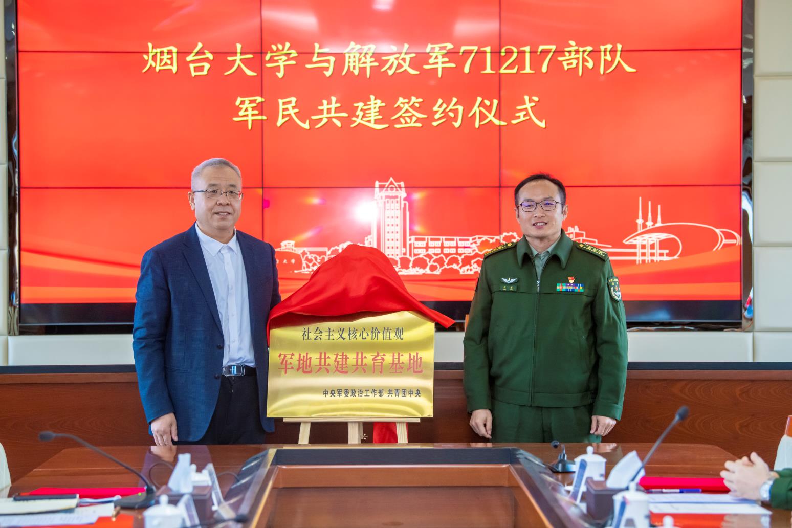 儀式上,71217部隊政治工作部上校主任孔勇和校團委書記劉超分別代表軍地雙方簽署了共建共育協(xié)議。71217部隊政治工作部上校主任孔勇和煙臺大學黨委常委、副校長畢可志共同為“社會主義核心價值觀軍地共建共育基地”揭牌,畢可志代表學校向部隊贈送“全國大學生社會實踐基地”牌匾。