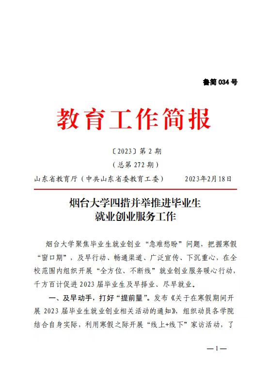 【本站訊】2月18日,山東省教育廳(中共山東省委教育工委)《教育工作簡報》2023年第2期刊發由黨委宣傳部聯合黨委學工部(處)提報的《煙臺大學四措并舉推進畢業生就業創業服務工作》的經驗總結材料,面向全省教育系統宣傳推廣煙臺大學聚焦畢業生就業創業的“急難愁盼”問題,把握寒假“窗口期”,及早行動、暢通渠道、廣泛宣傳、下沉重心,千方百計促進2023屆畢業生及早擇業、盡早就業的經驗做法。現將原文刊載如下: