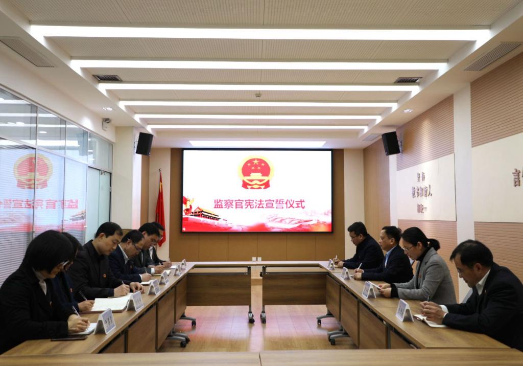 儀式現場,氣氛嚴肅莊重,正中央的宣誓臺上擺放著《中華人民共和國憲法》。宣誓儀式開始后,全場奏唱中華人民共和國國歌。隨后,領誓人左手撫按憲法,右手舉拳,領誦誓詞。其他監察官精神飽滿,列隊肅立,右手舉拳,跟誦誓詞,向憲法和人民作出莊嚴承諾。