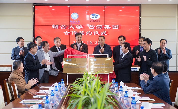 煙臺(tái)市臺(tái)海集團(tuán)有限公司總裁趙博鴻與煙臺(tái)大學(xué)校長郭善利代表雙方簽訂了合作協(xié)議,雙方將共同組建煙臺(tái)大學(xué)核裝備與核工程學(xué)院、臺(tái)海集團(tuán)煙臺(tái)大學(xué)核裝備與核工程技術(shù)研究院。金志海、包信勇、王雪欣、張偉共同為學(xué)院和研究院揭牌。