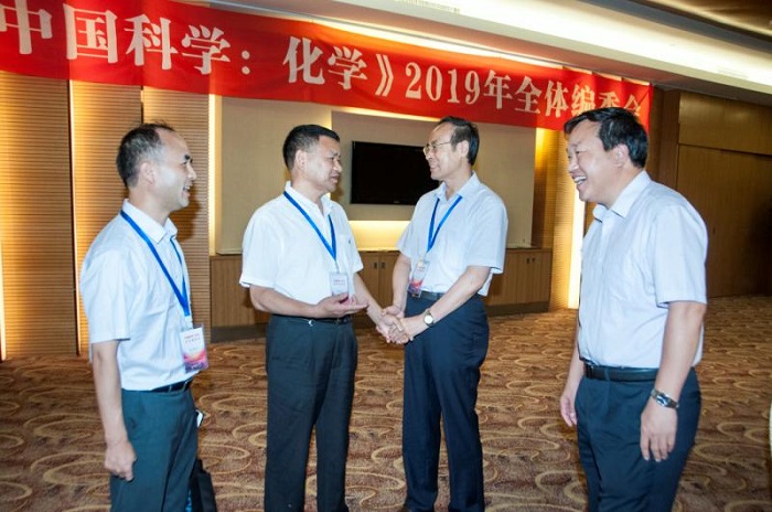 會議期間,我校黨委書記張偉陪同專家們參觀校史展,向專家們介紹煙臺大學創建初期北大清華的援建以及我校35年來的發展建設成就。李永航院士代表全體編委為煙大題詞:“熱愛+用心+努力+認真=成功。祝煙臺大學越辦越好!”我校校長郭善利受邀出席編委會全體會并在開幕式上致辭。他向專家們介紹了煙大以及化學化工學院的基本情況,并表示煙大能夠承辦如此高層次的會議是《中國科學:化學》全體編委的信任,這對煙大化學化工學科的發展乃至提升整個學校的辦學實力都具有重大意義。主編萬立駿院士感謝煙臺大學的承辦并祝煙大辦出特色,越辦越強。開幕式后,萬主編首先感謝各位主編的辛苦付出,并就提升期刊的國際影響力談了自己的看法。隨后,科學出版社總經理、“兩刊”編委會秘書長彭斌談到,《中國科學:化學》特別是英文版的學術影響力逐年穩步提高,這與每一位編委的努力密不可分。他還介紹了國家當前在提升國內期刊國際影響力方面給予的政策支持等。編輯部負責人張學梅匯報了期刊工作進展,分析了目前面臨的主要問題。優秀編委和優秀作者代表也紛紛發言。編委會上還宣布了2018年度《中國科學:化學》優秀編委名單。