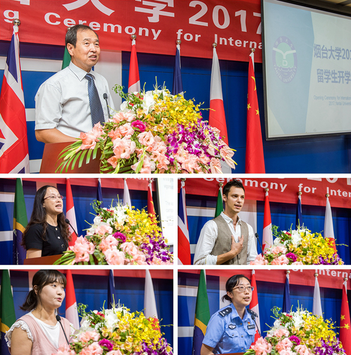 國際教育交流學院留學生漢語系主任牟文波作為教師代表發言,向留學生們提出學習漢語的三點建議。來自韓國的畢業留學生代表全善慶分享了自己從剛入學一句漢語都不會說到現在能用漢語與中國人交流的心路歷程,并向老師和同學們表示感謝。來自法國的留學生新生代表大衛同學則分別用漢語、法語、俄羅斯語、英語和葡萄牙語向大家致以問候,并用輕松幽默的語言介紹了自己和中國的淵源以及新生們來煙臺大學的不同原因。