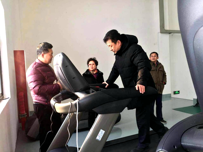 孫祥斌一行一邊現場查看場館一邊聽取活動中心主任情況匯報,并與大家親切交談。孫祥斌對教職工活動中心自2018年1月3日試運行以來精心服務,特別是寒假期間一直堅持每天下午三點到晚上九點開放,為廣大教職工提供衛生整潔舒適的健身環境給予充分肯定,對一線員工“雪情就是命令”,第一時間除雪除冰方便大家表示贊賞,聽到教職員工積極健身、非常滿意的反饋也十分高興。孫祥斌還對教職工活動中心試運行期間發現的地面排水不暢等問題作了進一步安排。