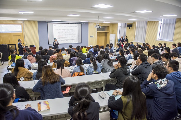 會見結束后,金仲秀作了題為“韓國經濟的過去成就與未來挑戰”的學術報告。煙臺市投資促進局及各縣市區招商部門的同志及我校經管學院、外國語學院140余名師生到場聆聽。