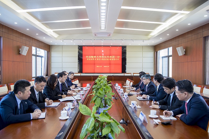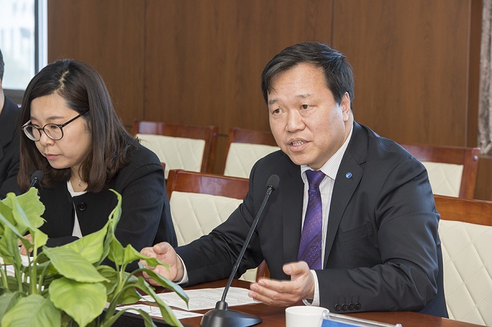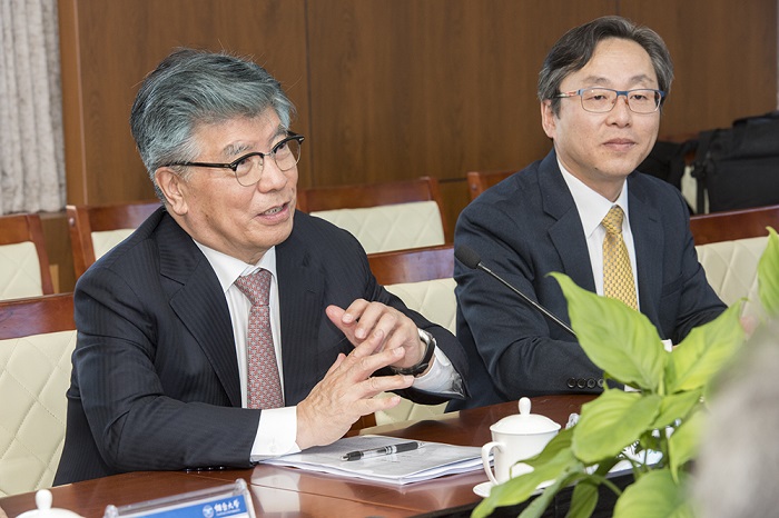 4 月19日上午,韓國翰林大學校長金仲秀率團來訪我校。煙臺大學校長郭善利、副校長宋中民會見了來賓一行。國際處、經管學院及外國語學院負責人參加會見。