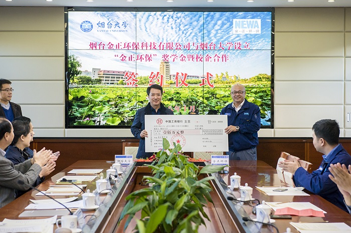 會上舉行了“金正環(huán)?!豹剬W(xué)金捐贈、校企合作簽約等儀式?!敖鹫h(huán)保獎學(xué)金”由煙臺金正環(huán)??萍加邢薰救~出資設(shè)立,總額一百萬元,簽約期限為五年,每年二十萬元。“金正環(huán)保獎學(xué)金”主要包括優(yōu)秀獎學(xué)金、創(chuàng)新獎學(xué)金、社會實踐獎學(xué)金三大類,用于獎勵煙臺大學(xué)品學(xué)兼優(yōu),尤其是在創(chuàng)新、創(chuàng)業(yè)和社會實踐方面表現(xiàn)突出的本科生和研究生。