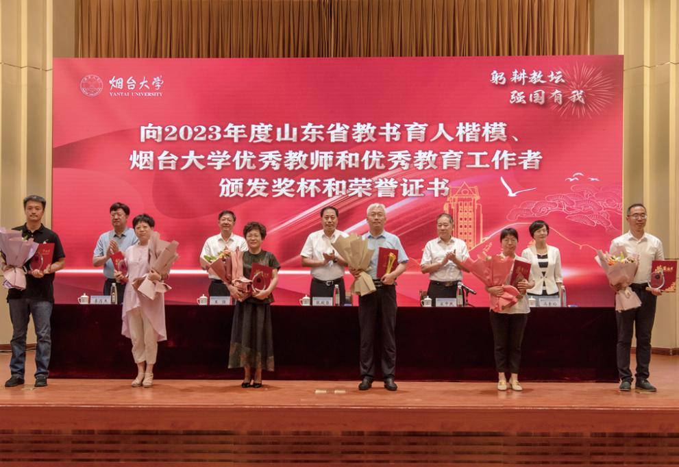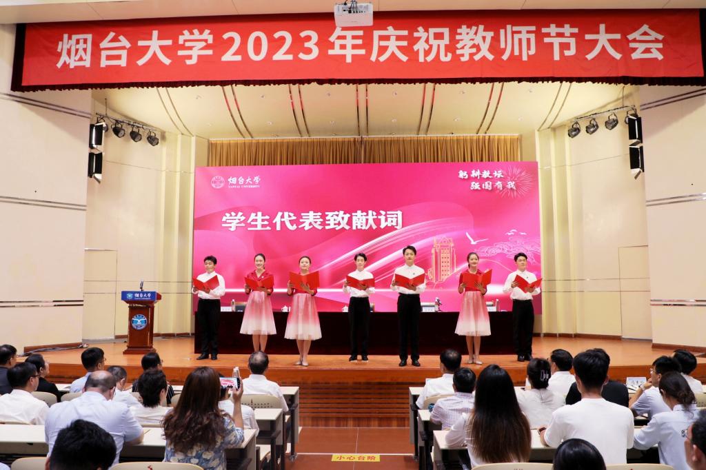 “今天,我們向最美園丁致敬,致敬一種精神叫做甘為人梯,堅實的臂膀托舉學生攀登新的高峰;致敬一種美德叫做甘化春蠶,杰出的才能讓知識與智慧延展……”今年,煙大學子為致敬辛勤培育他們的老師,特原創一首節日獻詞,并由學生代表在教師節慶祝大會上現場朗誦,送上他們最真摯的感謝與祝福。此外,來自全國各地的校友代表、在校學生代表也通過視頻的方式,向老師致以節日的問候和祝福,表示將不忘教誨、砥礪前行,在本職崗位上兢兢業業、發光發熱,為全面建成社會主義現代化強國貢獻力量。隨后,受表彰和激勵的老師滿懷幸福喜悅的心情,在全場熱烈的掌聲中上臺接過獎杯和證書、佩戴榮譽紀念獎章,學生代表獻上美麗的鮮花表達對老師們最誠摯的敬意。