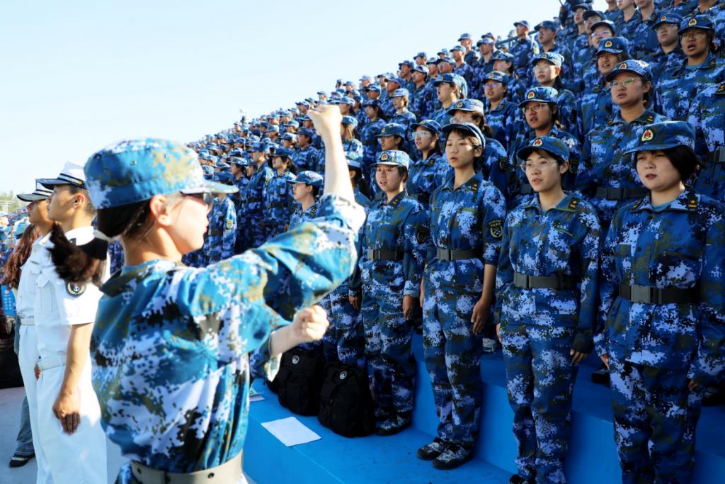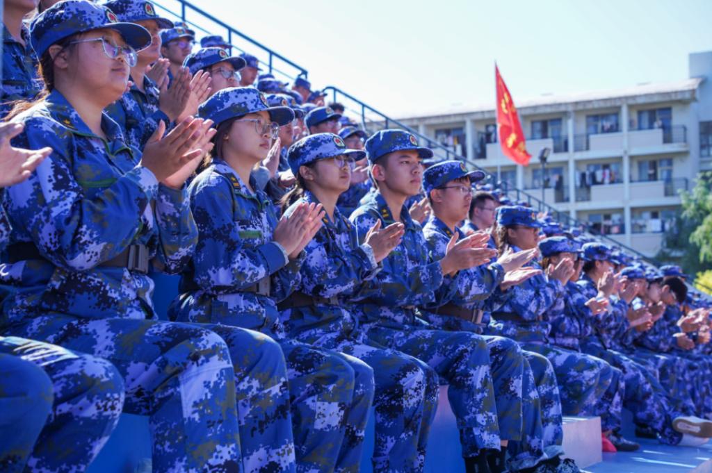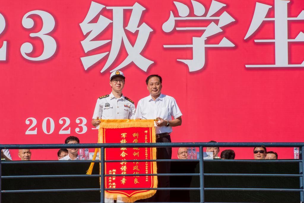 隨后,黨委書記張殿臣向海軍航空大學贈送錦旗。隨著張殿臣宣布“分列式開始”,由2023級本科新生組成的23個軍訓方隊,身著迷彩“藍”,以飽滿的精神狀態、堅定的步伐,在響亮的口號聲中接受檢閱。金秋的藍天白云、廣闊的綠茵場和被汗水浸透的挺拔身姿,共同構成一幅美麗的圖景、交匯為斑斕的青春記憶。