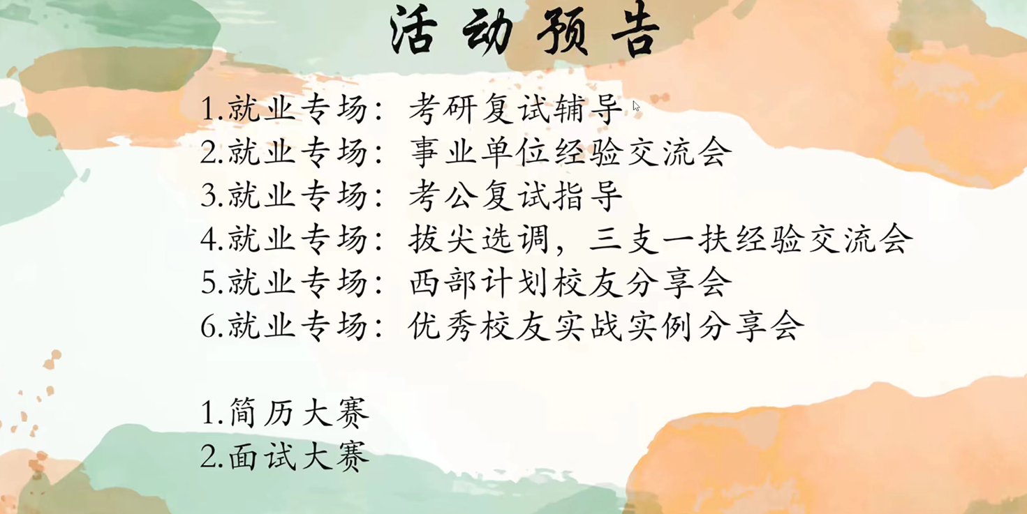 各學院開展“就業育人”主題教育系列活動,助力畢業生提升實踐能力。文學與新聞傳播學院本科生李雅楠在學院“簡歷大賽”線上活動中獲得一等獎,“原來簡歷制作水平的高低對于求職能否成功這么關鍵!在老師們的精心指導下,我才知道想象中的簡歷和實際求職時所需要的簡歷差別有多大。”李雅楠感嘆道。物理與電子信息學院組織開展“考研如何一擊而中”專家講壇、“成‘公’有你‘編’織未來”考公考編指導講座,邀請專業課教師、公考指導教師為學生排憂解惑,增強畢業生考研、考公信心與就業能力,提升競爭內驅力。