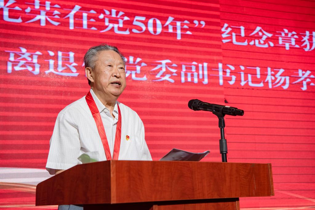 紀(jì)念章獲得者楊孝麥代表全體老黨員發(fā)言,表示將永遠(yuǎn)聽黨話,跟黨走,做到離崗不離黨,退休不褪色;要干到老,學(xué)到老,做到立場堅(jiān)定,思想常新,繼續(xù)為學(xué)校高水平大學(xué)建設(shè)貢獻(xiàn)銀齡力量。
