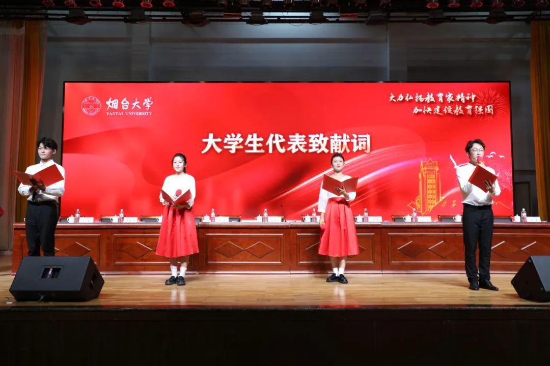 “今天,我們弘揚教育家精神,躬耕教壇、踐行使命;今天,我們歌頌煙大孺子牛,弦歌相繼、揚帆遠航。奮進在教育強國大路上,讓我們共同守護煙園的榮光,鑄就新的輝煌!”煙大學子以一首原創(chuàng)獻詞禮贊人民教師、致敬人民教師,表達對老師的濃濃感恩之情。此外,來自全國各地的校友代表、在校學生代表通過視頻的方式向老師們致以崇高敬意和真摯祝福。