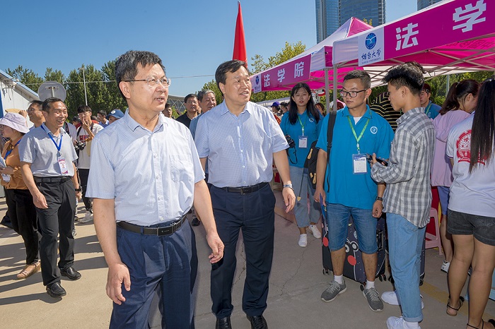 上午九時,黨委書記張偉,校長郭善利,副校長鄧昌亮、王強與有關部門負責人一起來到南校區迎新現場,看望2019級新同學,慰問奮戰在迎新一線的工作人員。在各學院和相關部門迎新服務點,學校領導詳細詢問新生報到有關情況,并向辛勤工作在迎新一線的師生和志愿者表示感謝,對迎新工作的有序開展給予充分肯定。在“綠色通道”辦理處,校領導仔細詢問了家庭經濟困難新生的報到情況和綠色通道申請情況,叮囑工作人員一定要讓家庭經濟困難的學生都能順利入學。