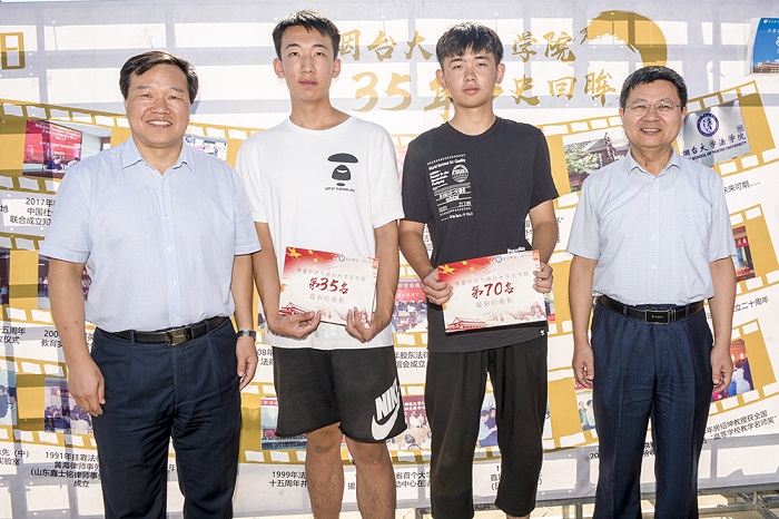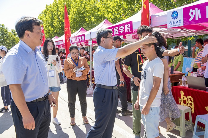 今年是新中國成立70周年、煙臺大學建校35周年,學校領導受邀與法學院第35位、第70位前來報到的新生親切合影。8月31日恰逢外國語學院四川籍新生鄧秋19歲生日,學院給他過了一個難忘的生日,黨委書記張偉受邀給他戴上生日帽,并祝他生日快樂,同時勉勵全體2019級新生為夢想努力奮斗。在“寄語未來”信箱處,校長郭善利親手書寫了一張明信片,寄語2019級新生“好學、進步,progress”。迎新過程中,各學院利用學生喜聞樂見的方式開展新生入學教育,體現專業特色的吉祥物森森、淼淼、土木君、生小科、空空、小藥丸等引得眾多新生合影留念;“青年成長之樹”、“四年之約”郵箱、“寄語未來”信箱,勉勵新生找準自己的成長目標,做好大學生活規劃;“菁英主播團”以直播方式帶領新生了解報到流程、熟悉校園環境,為新生答疑解惑,傳播正能量;為特困新生準備資助大禮包、愛心手提袋,幫助學生戰勝困難,彰顯濃濃的人文關懷;舉辦科普展覽、放置專業相關模型,以迎新契機進行專業認知教育,讓大學生活不再迷茫;精心手繪“初心樹”,響應習近平總書記在紀念五四運動100周年大會上對新時代中國青年提出的六點要求,期盼新生不忘初心,譜寫燦爛篇章……
