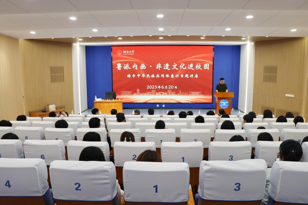 【本站訊】6月20日,學校舉辦“魯派內畫·非遺文化進校園”講座,旨在弘揚中華優秀傳統文化,切實加強鑄牢中華民族共同體意識教育,提升學生的文化感知力和傳承使命感。國家級非物質文化遺產“魯派內畫”傳承人、山東省工藝美術大師鄭玉慧女士受邀開展講座。煙臺大學黨委副書記王強,山東省政協委員、民盟淄博市委會主委李玲,民盟煙臺市委會秘書長鞠曉明,省工藝美術大師、中國工藝美術學會石雕專委會副主任常宗林,學校黨委常委、統戰部部長畢朝輝等出席,部分教師、少數民族學生代表參加活動。