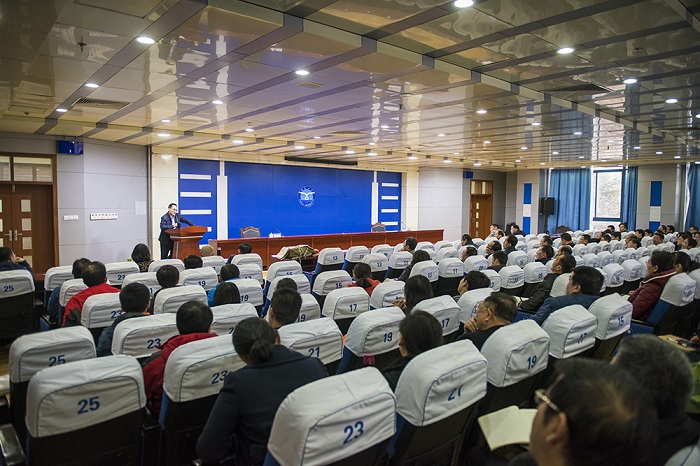 為深入貫徹落實全國宣傳思想工作會議精神,切實加強高校意識形態工作,根據黨務干部培訓安排,11月21日下午,山東師范大學黨委宣傳部部長姚昌應邀來校作《高舉旗幟,筑牢陣地,培育新人》專題輔導報告。黨委工作部門負責人,各二級單位黨組織書記、副書記、委員,基層黨支部書記參加報告會。報告會由黨委副書記張殿臣主持。