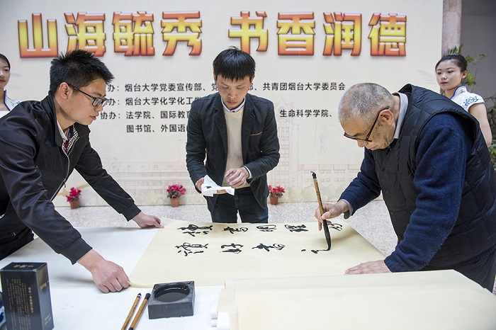 市委宣傳部副部長李波為讀書節打開書冊,學校黨委書記張偉宣布讀書節開幕。本屆讀書節旨在推動煙臺市全民閱讀建設,讓煙臺這座歷史文化名城溢滿書香。副校長王強在致辭中號召全體師生捧起書本,享受讀書的快樂,追求知識的真諦。副校長孫祥斌代表學校向本屆讀書節贈送《北大清華名師演講錄》和煙臺大學編寫的名譽校長張承先文集,同時邀請人文學院和馬克思主義學院的教授為讀書節捐贈著作。退休教師韓冬冰現場揮毫潑墨,勉勵同學們“好讀書,讀好書”,有關部門領導、教師代表和學生代表向師生們推薦了好書。活動現場,“領讀者”和合唱團帶來的《我和我的祖國》更是表達了煙大學子“為中華之崛起而讀書”的決心與信念。