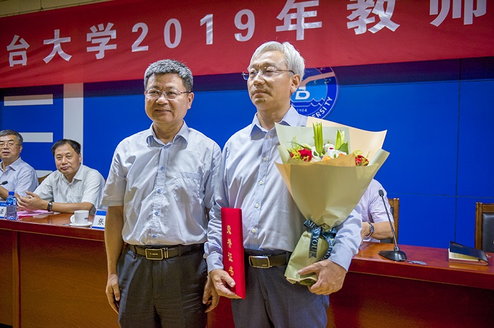 黨委副書記張殿臣宣讀《關(guān)于向在教育服務(wù)崗位工作滿30年、在煙臺(tái)大學(xué)教育服務(wù)崗位工作滿20年的教師和教育工作者頒發(fā)“孺子牛”榮譽(yù)紀(jì)念獎(jiǎng)?wù)碌臎Q定》,學(xué)校領(lǐng)導(dǎo)向在教育服務(wù)崗位工作滿30年、在煙臺(tái)大學(xué)教育服務(wù)崗位工作滿20年的教師和教育工作者頒發(fā)榮譽(yù)紀(jì)念獎(jiǎng)?wù)隆?huì)議對(duì)獲得“2019年山東省優(yōu)秀教師”榮譽(yù)稱號(hào)的吳昭景教授進(jìn)行表彰,黨委書記張偉向吳昭景教授頒發(fā)了榮譽(yù)證書。