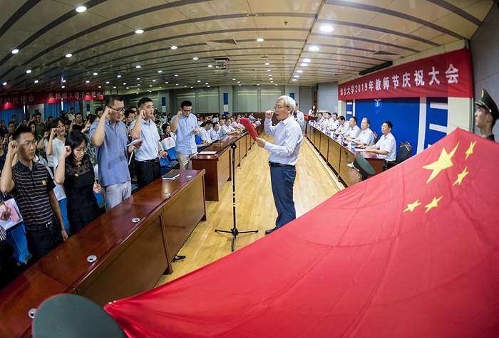 “我志愿加入煙臺(tái)大學(xué),成為一名光榮的人民教師!愛國(guó)守法,敬業(yè)愛生,教書育人,知行合一,嚴(yán)謹(jǐn)治學(xué),服務(wù)社會(huì),修身立德,為人師表。弘揚(yáng)優(yōu)秀文化,傳承煙大精神,守信、求實(shí)、好學(xué)、力行,不忘初心、牢記使命,做黨和人民滿意的好老師,為崇高的教育事業(yè)而努力奮斗!”2019年山東省優(yōu)秀教師吳昭景教授帶領(lǐng)新入職教師面向國(guó)旗莊嚴(yán)宣誓,聲聲誓言詮釋了煙大教師潛心立德樹人的堅(jiān)定志向。