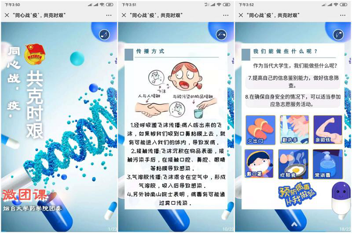 疫情發生后,經濟管理學院充分運用新媒體平臺宣傳防疫知識,以微團課的形式,將學生的教育引導和防控工作通過線上做深做細。“細胞戰斗實錄——新冠肺炎被治愈的過程”“新冠肺炎12問你get到了嗎”“這張卷子,你能得幾分”“其實,你知道怎么做”“同學,你知道什么是氣溶膠傳播嗎”……各類防疫小知識不僅擴展了師生的知識面,而且讓大家明白了科學防疫的重要性。