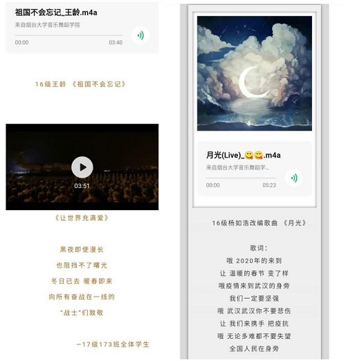 法學院學生陳嘉琦、張冉、曲珈慧將關懷與祝福寫進歌中,原創歌曲《遠距離擁抱愛》,為武漢加油,這是疫情發生之后,藝術馳援抗“疫”的又一首公益歌曲。創作靈感來自于一個畫面:女兒來到醫院給當醫生的媽媽送飯,相見卻不能相擁。隔著隔離區,女兒舉起雙臂隔空“擁抱”了媽媽,雖沒有肢體上的接觸,但母女兩人的心卻緊緊相連。《煙臺晚報》對其創作始末進行了詳細報道。