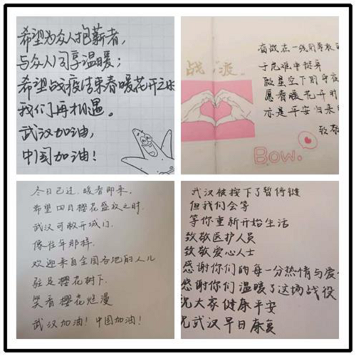 “身體怎么樣”“居住飲食有沒有受到影響”“一定要注意個人衛生”……環境材料與工程學院時刻牽掛著身在湖北的學子,在疫情爆發以來,就立即組織安排相關老師,為學生送上關心。14位環材學院湖北籍學子收到關心后,紛紛發出回應以報平安。環181-1李嫣然說道:“謝謝大家的關心,我家在湖北襄陽,這里雖然不是疫情最嚴重的地方,但是我們依然保持著警惕,我們一切都好。”環材學院還組織學生用“手寫加油接力”的方式為湖北籍學子、為身處一線的醫護人員們和武漢人民加油助威。